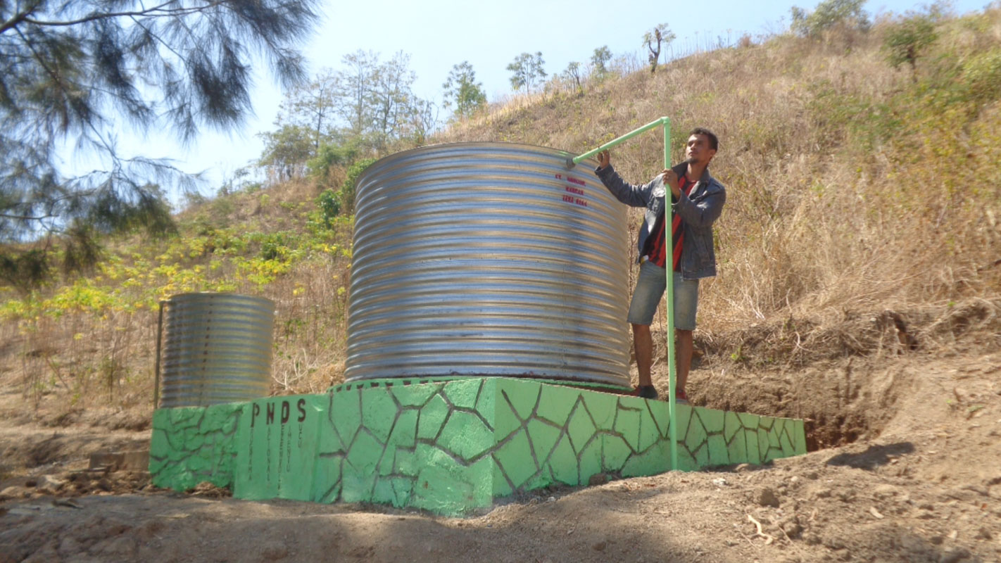 A man stands next to a water tanks
