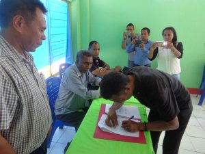 Chefe Suku Batugade, Januario Moises, asina hela akordu implementasaun, asiste direita husi Diretor PNDS, Presidente Autoridade ho Adjunto Komandante PNTL Munisipiu Bobonaro
