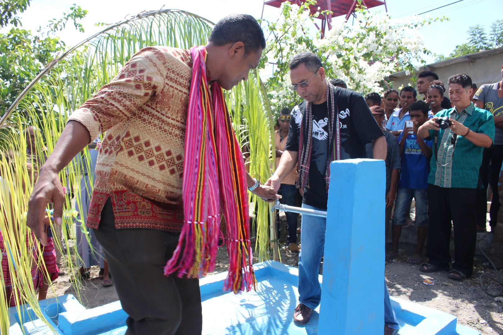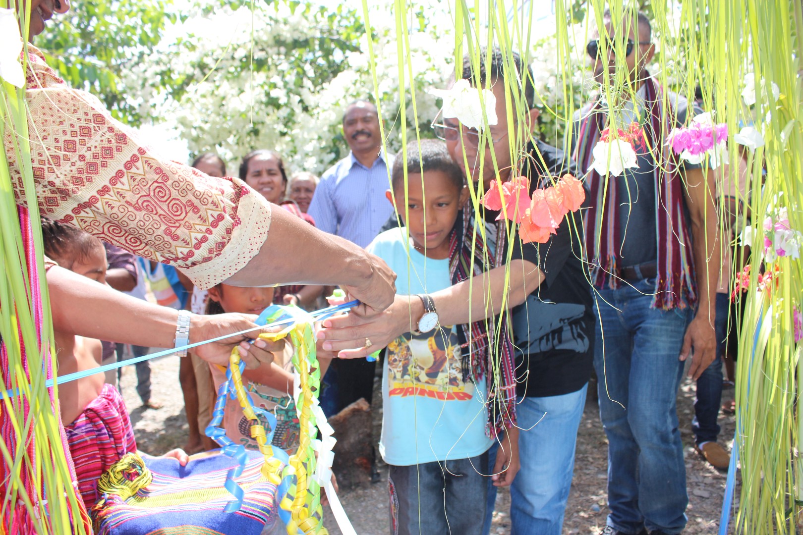 Diretor Geral ADN,akompanha husi labarik kiik iha Aldeai Kamalehohoru tesi pita, simbolu inagurasaun ba bee mos neebe kontrui iha Aldeia refere.