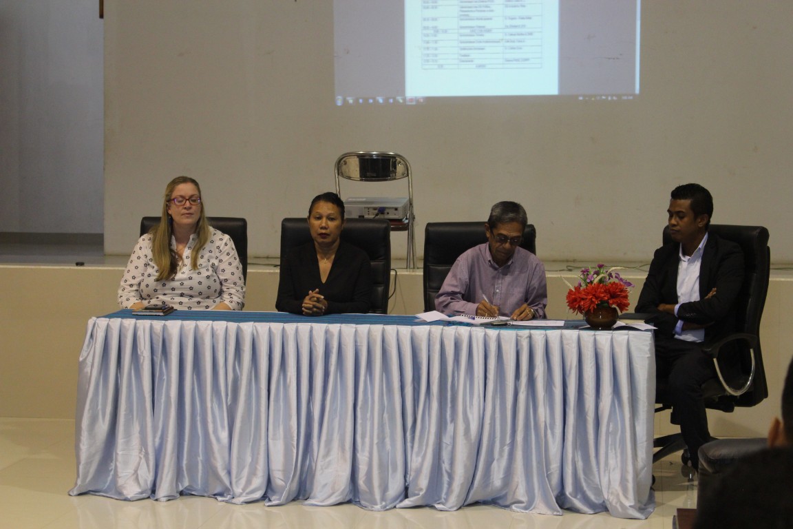 Diretur Geral Polika Planeamentu no Parceria Ministeriu Edukasaun, Antoninho Pires Akompanha husi Diretora Nasional PNDS Dulce Guterres Junior no Tim lider Cardno abertura Enkontru Kordenasaun Nasional ba Implementasaun Eskola 9