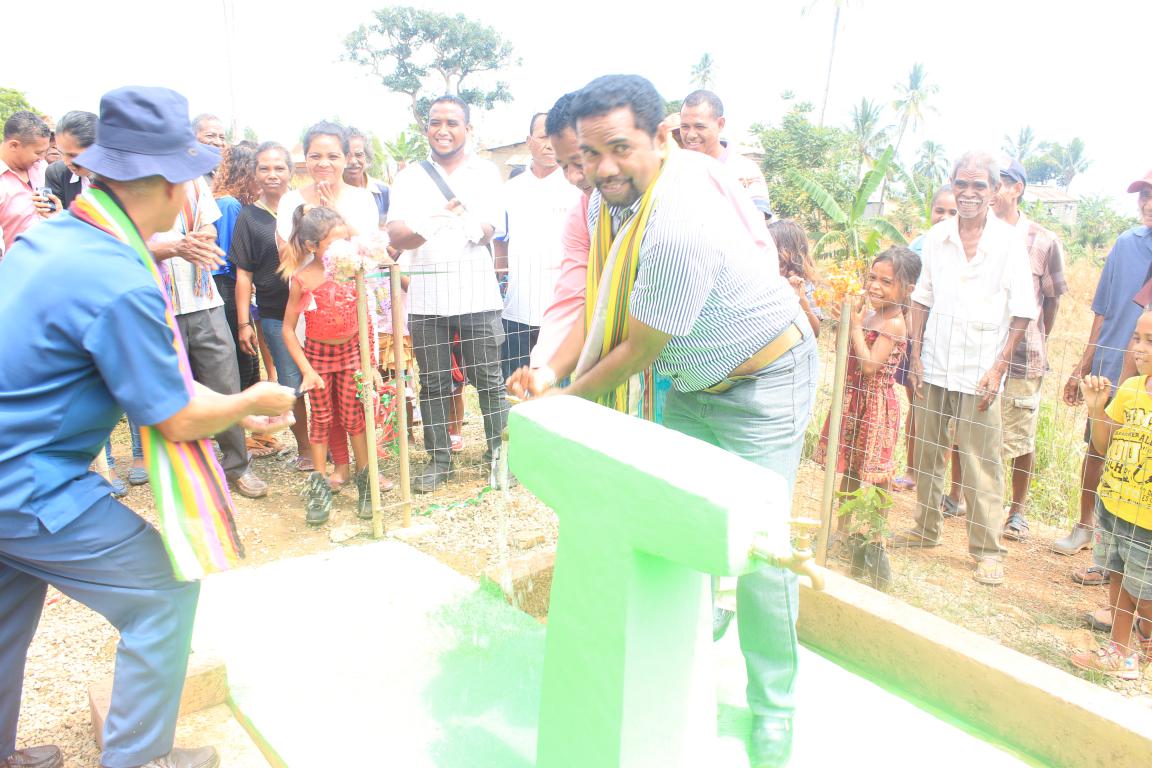 Adjunto Administrador Munisipiu Dili Sr. Jeca Smith offisialmente loke Torneira Be’e Mos hanesan simbol inagurasaun ba projeitu Be’e nee’be konstrui ho osamentu PNDS iha Suku Lahane-Oriental, Aldeia Rai-Mean