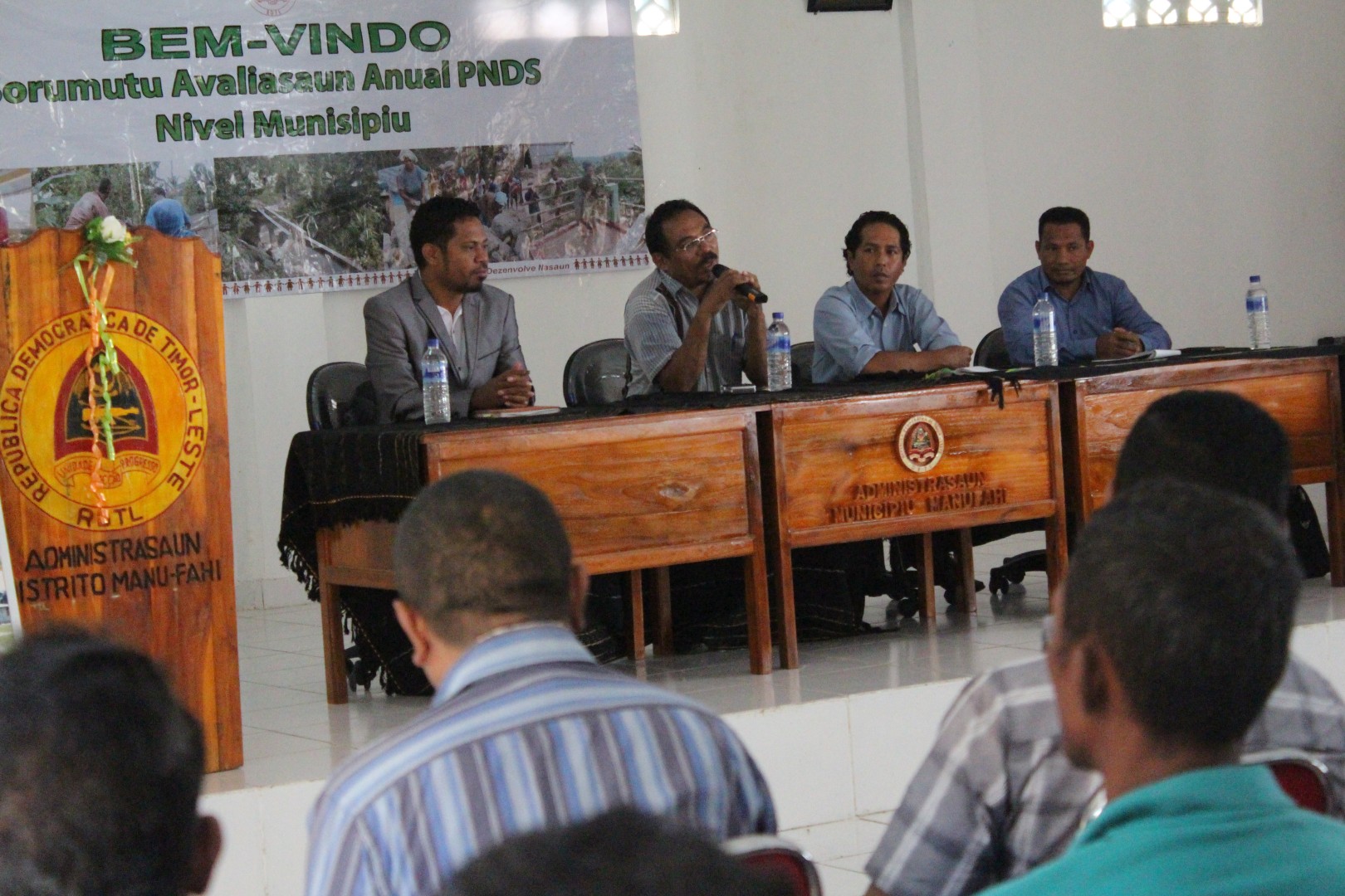 Administrador Munisipiu Manufahi Carlito pinhero Loke enkontru Avaliasaun Annual PNDS Munisipiu Manufahi, iha Salaun Enkontru Munisipal (29/03/2017).