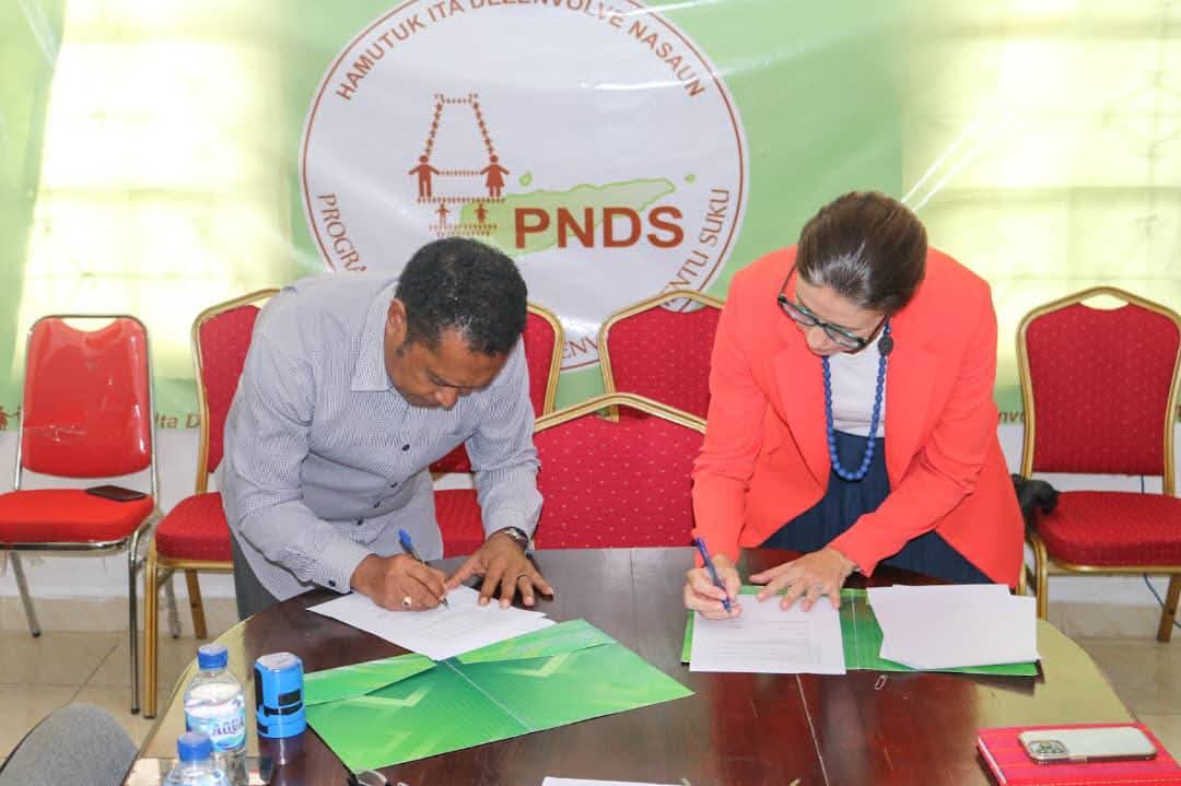 Sekretáriu Ezekutivu PNDS, Amandio Paulino Gastão do Rosário de Sousa hala’o asinatura Nota de Akordu entre ST-PNDS ho Team Leader PARTISIPA, Emer Purdon.
